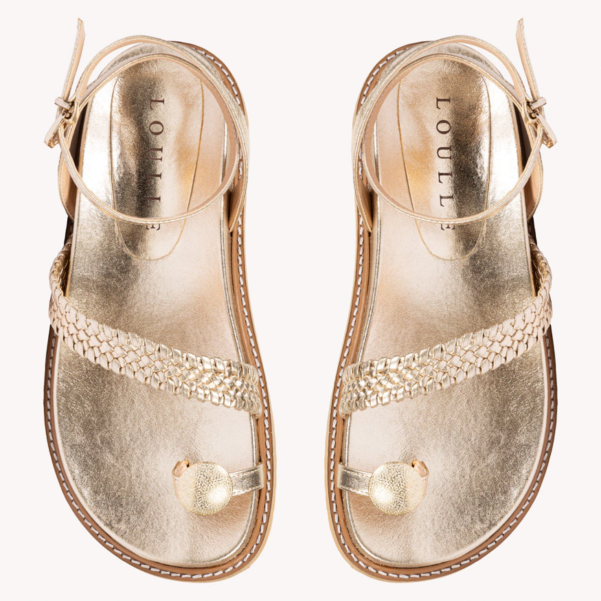 Couro Metalizado: Confeccionada em couro metalizado, a sandália exibe um brilho dourado sutil elegante que adiciona um toque de glamour.