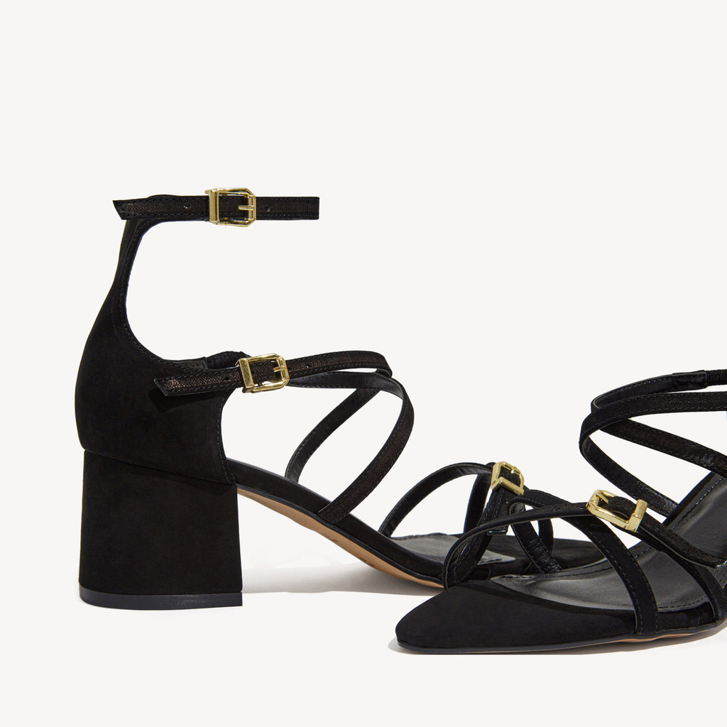 Com um design moderno e marcante, a sandália apresenta um salto bloco robusto que proporciona estabilidade e conforto durante todo o dia. O bico fino adiciona um toque de refinamento, enquanto o couro nobuck confere sofisticação, elevando qualquer look.